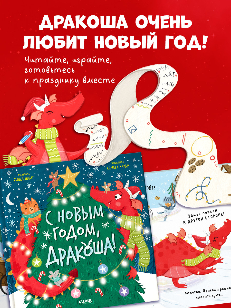 Вместе с Дракошей малыш будет составлять список новогодних дел, петь песенки, развешивать гирлянды на страницах книжки и рисовать на снегу ангела.