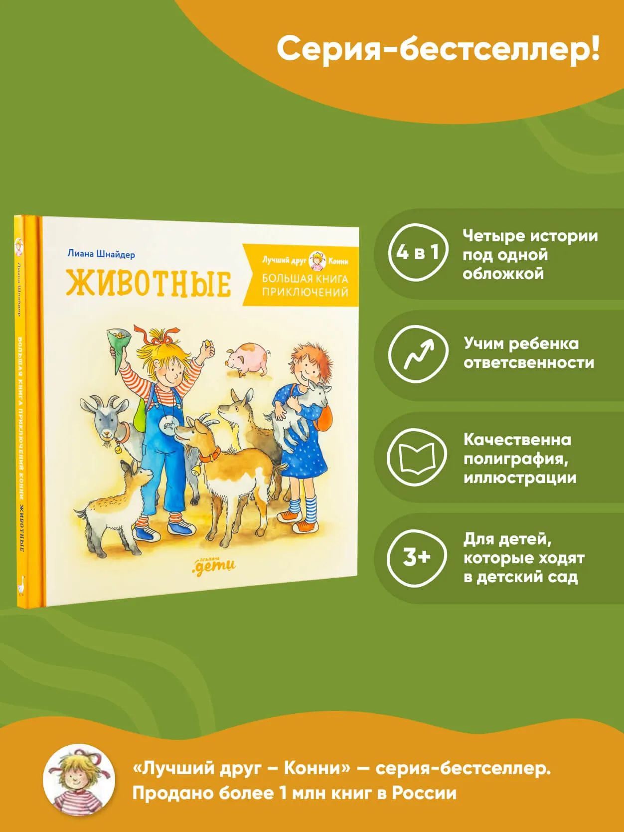 “Лучший друг — Конни” — серия-бестселлер: в России продано более 300 000 книг. Серия охватывают все жизненные навыки, с которыми ребенок встречается во время взросления от 3 до 15 лет.