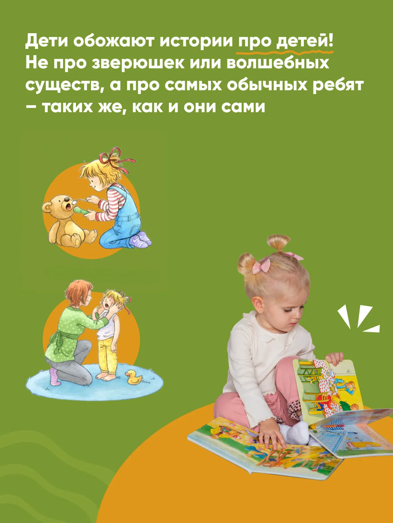 Ассоциируя себя с главной героиней, малыш проживает ее историю, учится и познает мир. С этими книгами ребенок перестанет бояться врача, первого дня в садике или школе, поймет, что животные в доме — это большая ответственность.