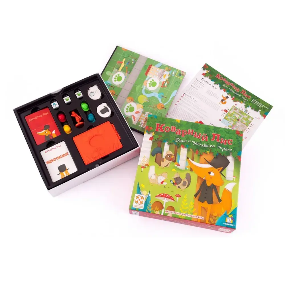 В городе был замечен Коварный Лис, который сумел увести пирог прямо у вас из-под носа! Все лисы теперь попали под подозрение, но кто же из них похитил ваше лакомство? В настольной игре Коварный лис вам предстоит выследить, вычислить и поймать хитреца до того, как он спрячется в своей норе. А для этого необходимо действовать сообща, используя подсказки, рассматривая улики (с помощью специального дешифровщика!) и снимая подозрения с невиновных.
