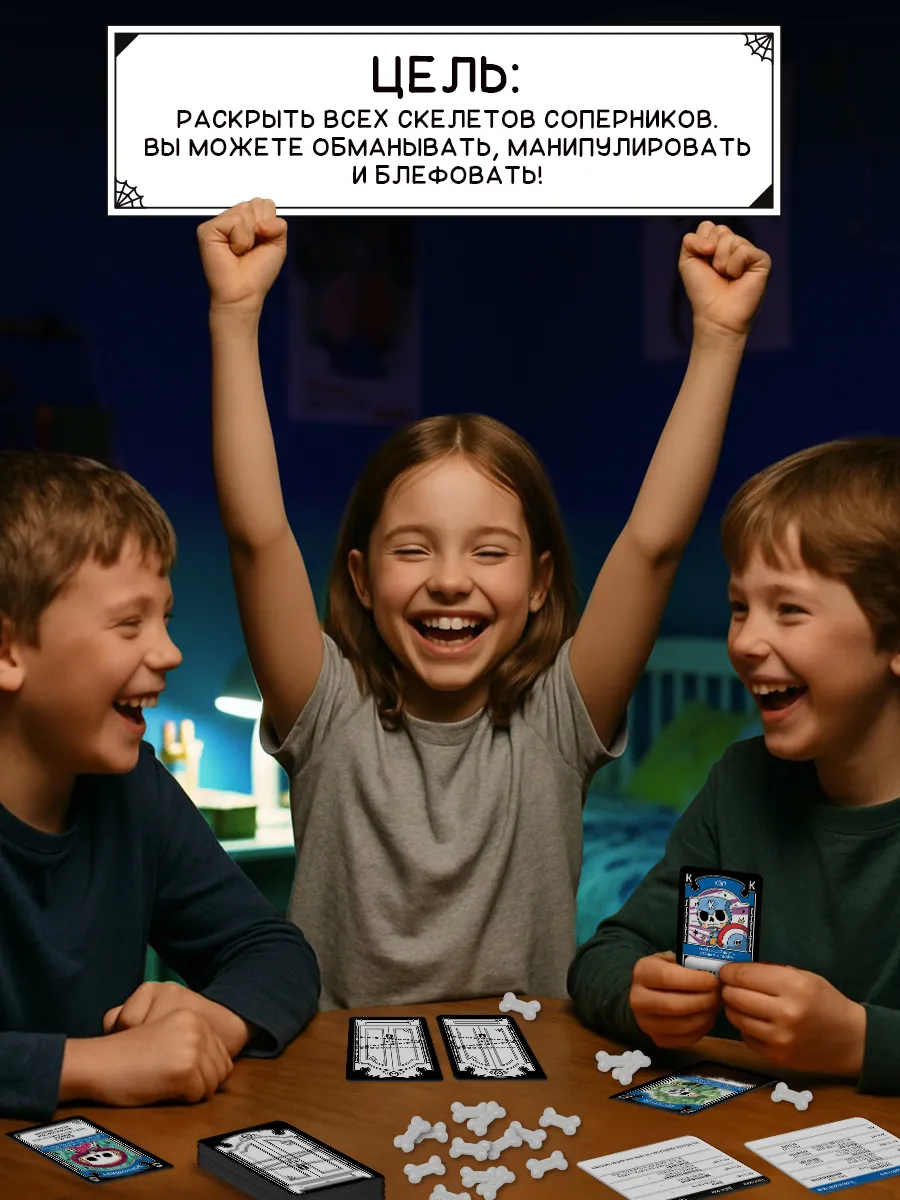 Цель игры — раскрыть всех скелетов соперников и остаться последним, кто сумеет сохранить свои тайны в секрете. Вы можете обманывать, менять карты, защищаться от атак и строить хитрые стратегии, чтобы одурачить друзей. Простые правила и быстрое обучение делают игру лёгкой в освоении даже для новичков.