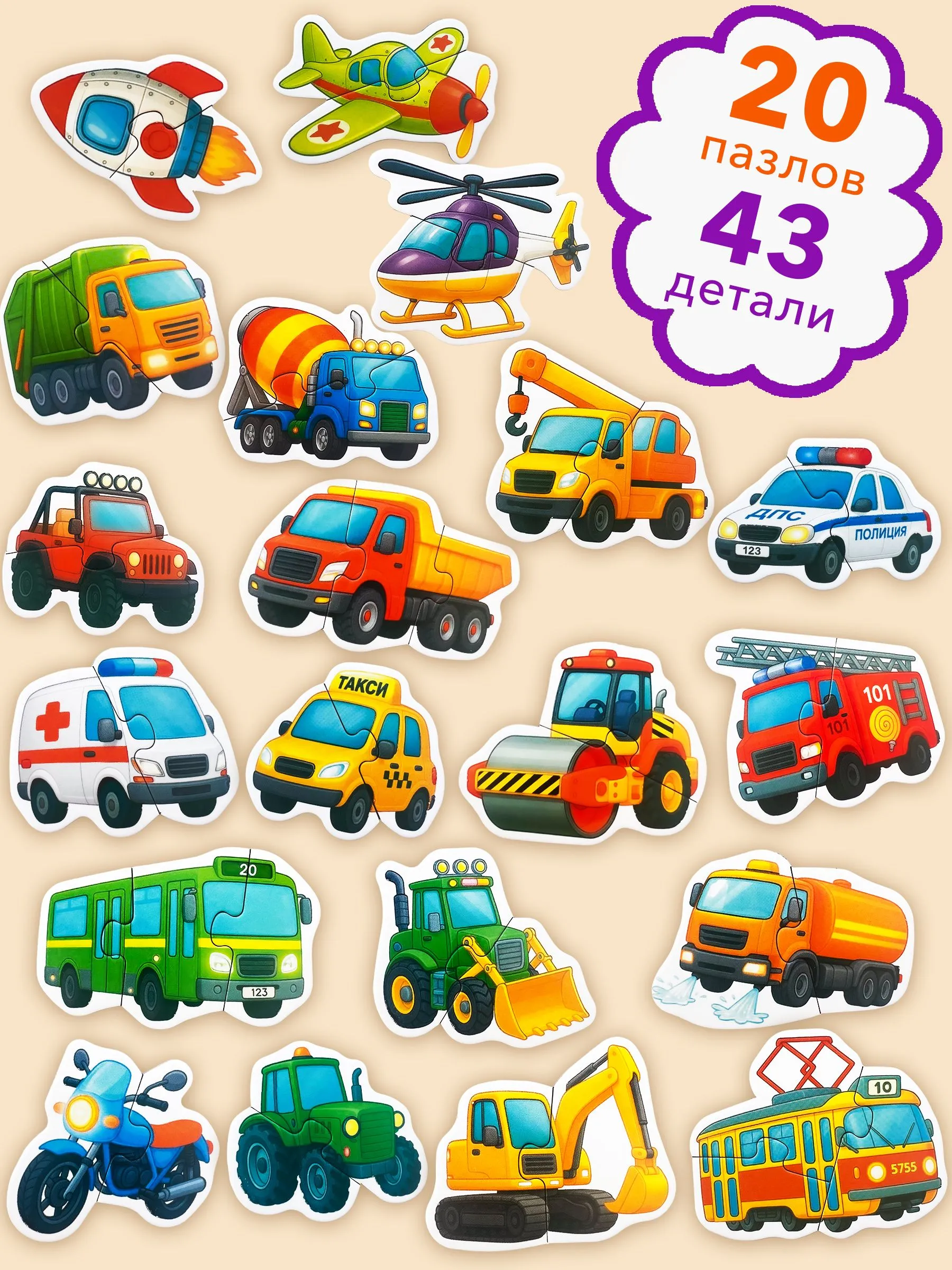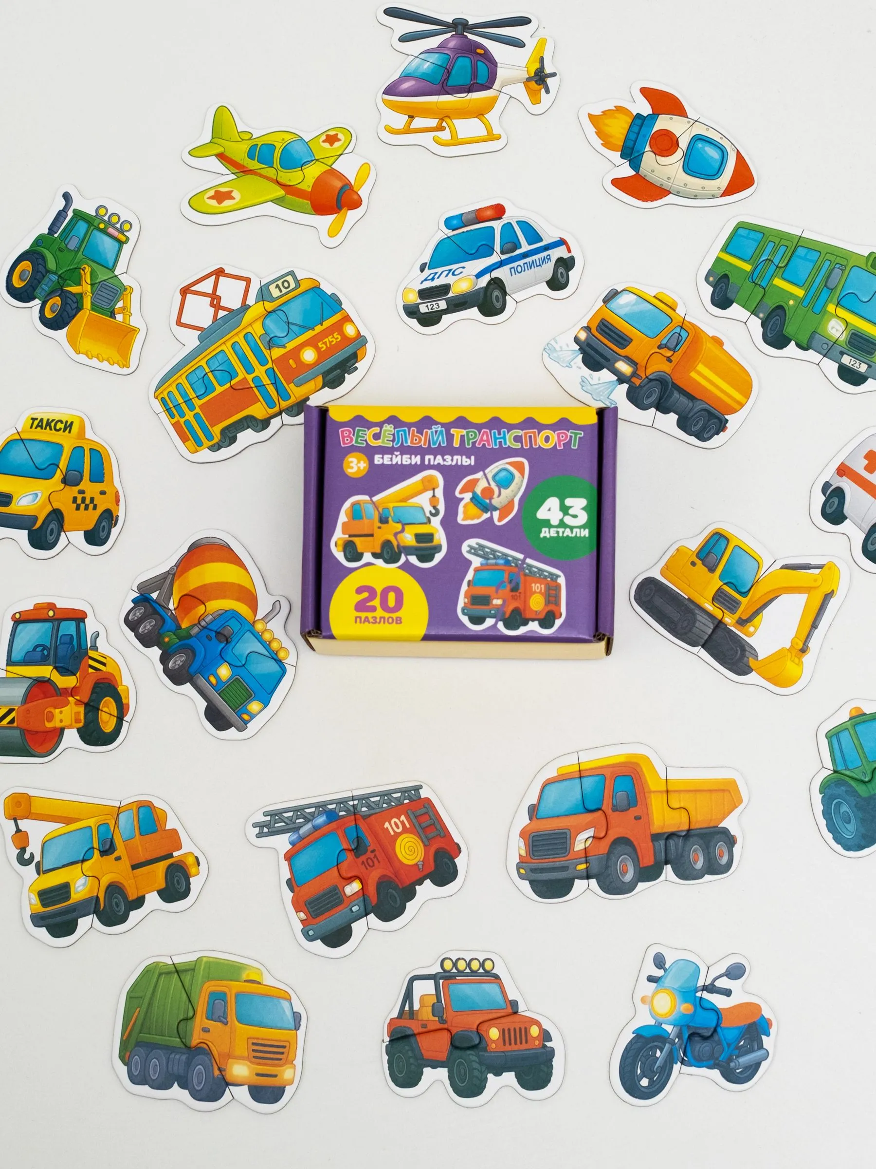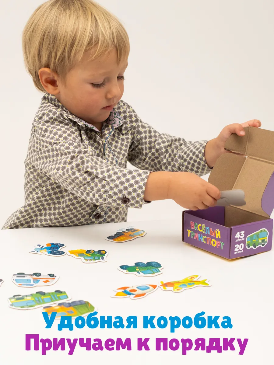 В составе развивашки 20 пазлов из 44 деталей.