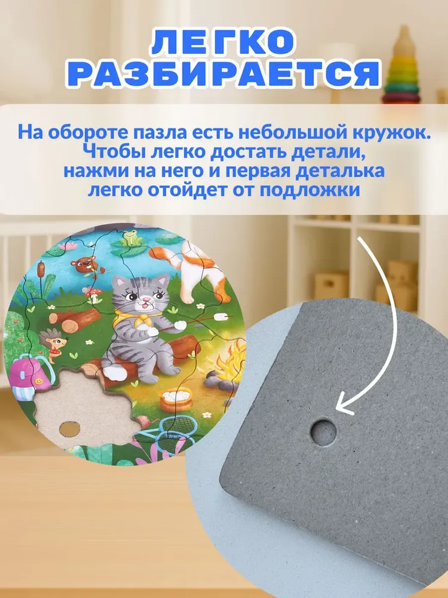 Чтобы легко достать детали, нажмите на небольшое круглое отверстие, которое сзади. Ребенок сможет легко собрать картинку, тренируя полезные навыки. Альтернатива таким игрушкам как деревянный и мягкий пазл.