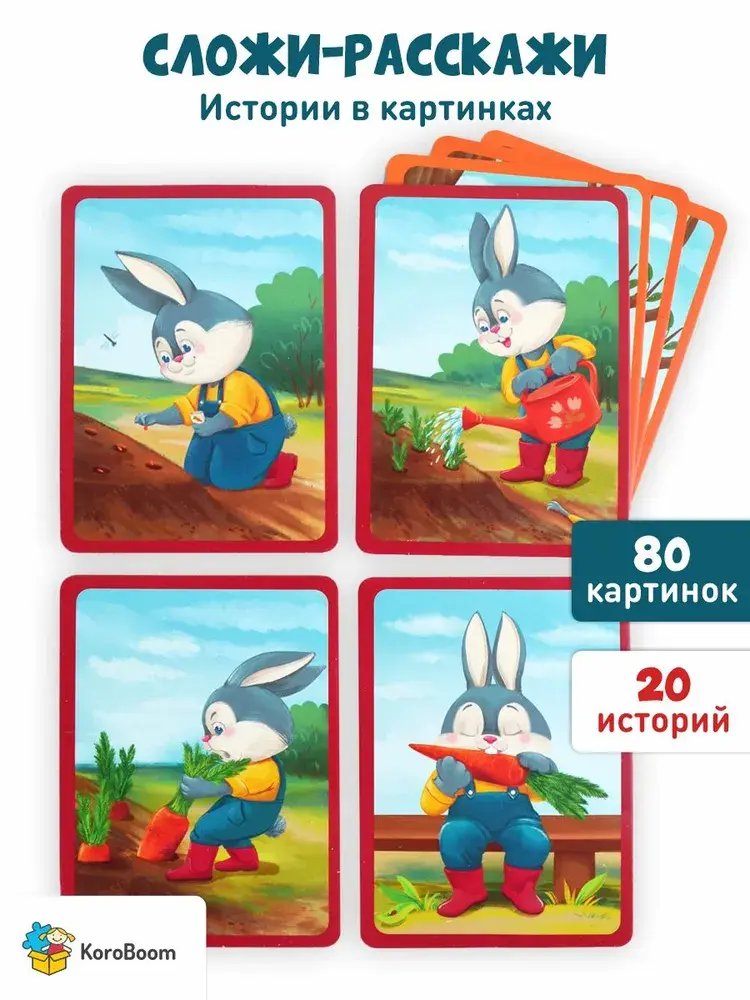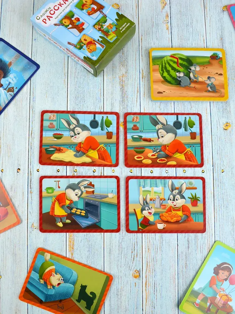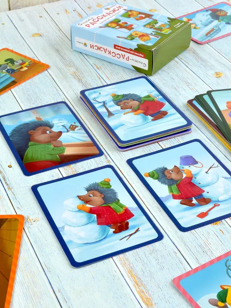 В комплекте вы найдете 40 двусторонних карточек с яркими и понятными иллюстрациями, что в сумме дает 80 картинок для составления увлекательных историй.