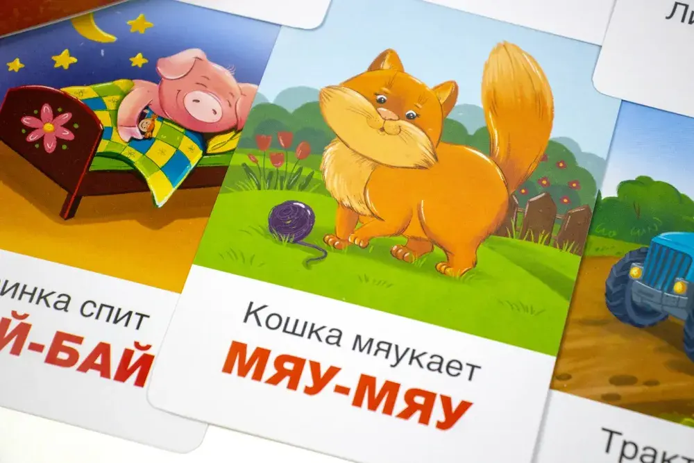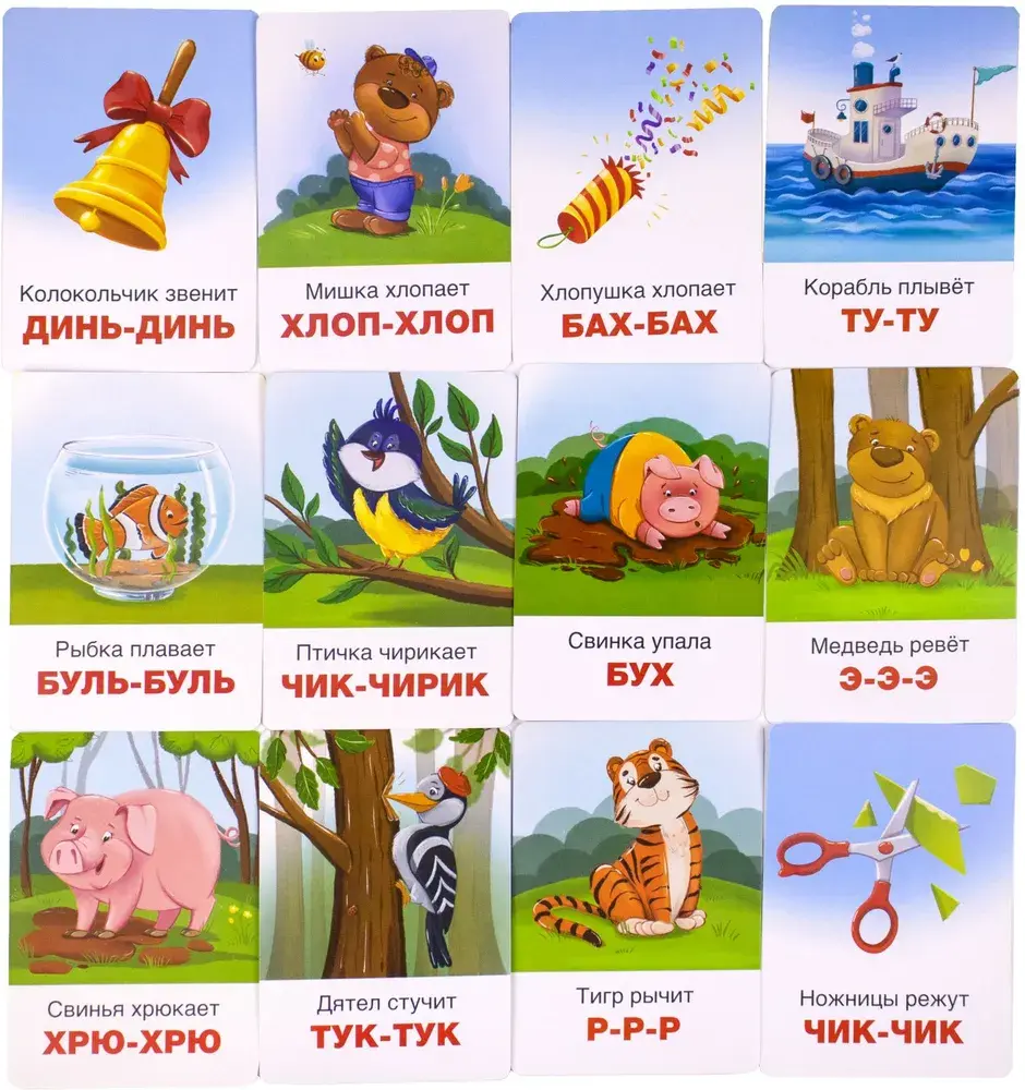 Развивающие логопедические карточки KoroBoom / Коробум Звукоподражания "Кто как говорит и Что как звучит" для детей, 26 карточек для развития речи, говорилки, лепеталки для малышей, говорушки-повторялки, учимся говорить, карточки животные. Размер карточек: 10 х 14 см.