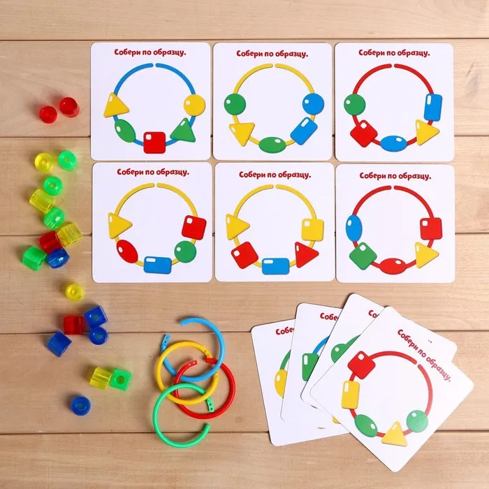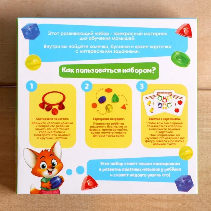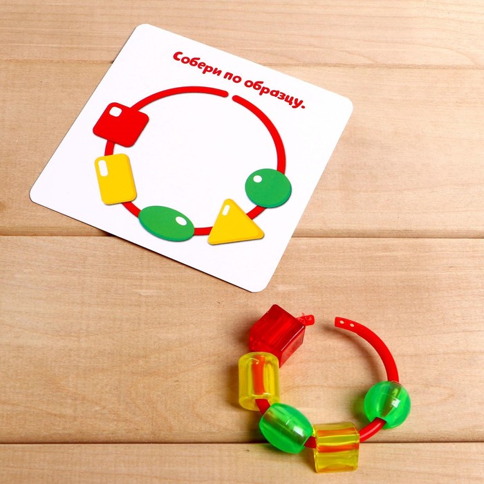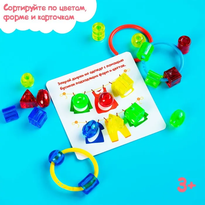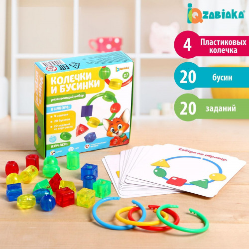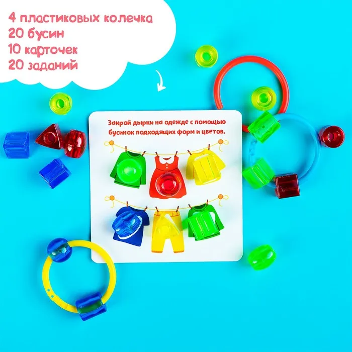 Этот развивающий набор — прекрасный материал для обучения малышей. Внутри вы найдёте колечки, бусинки и яркие карточки с интересными заданиями!