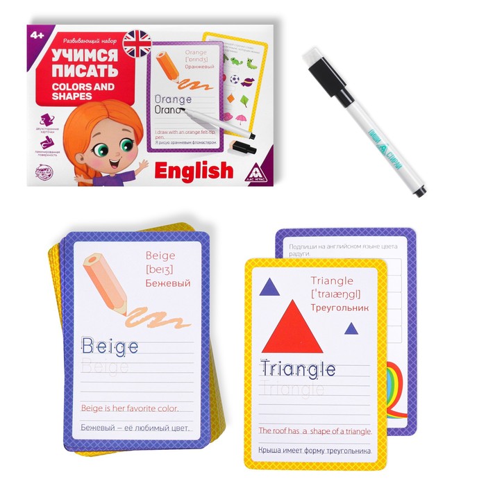 Возьмите карточку с заданием, покажите и расскажите ребёнку о задании и цвете/форме. Прочтите слово на английском, пусть ваш ребёнок повторит за вами. Для закрепления знаний дайте ребёнку маркер из набора и предложите ему сначала обвести буквы на карточке, а потом написать слово на английском языке.