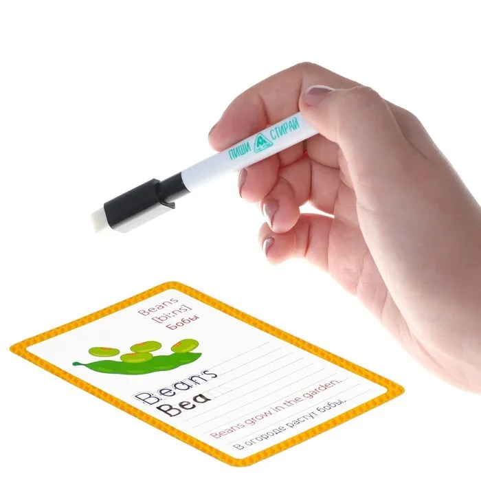 В этой коробочке ребенка ждут 30 заданий, которые помогут изучить названия цветов и фигур на английском языке. А так как карточки ламинированные, на них можно писать и легко стирать написанное обратной стороной маркера.