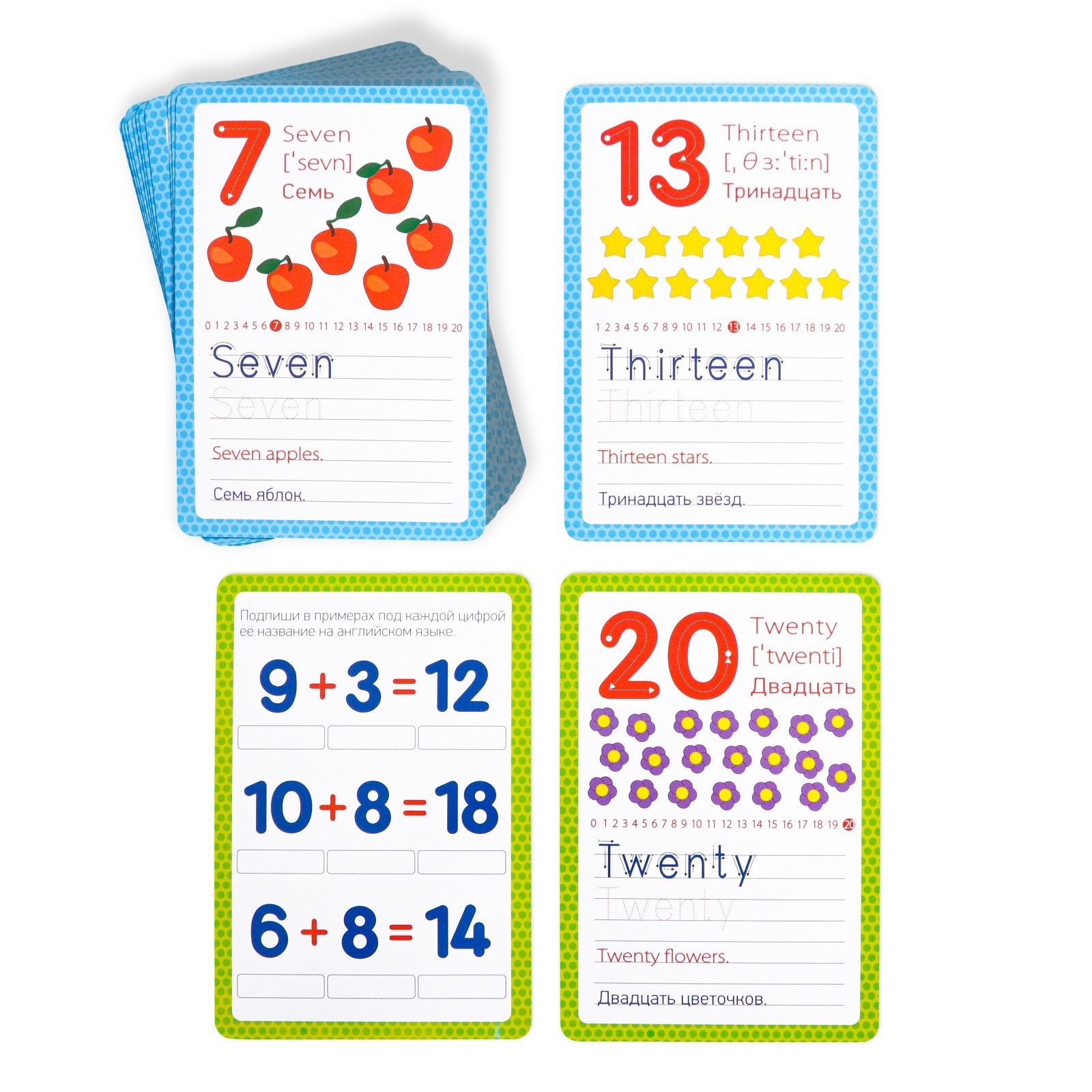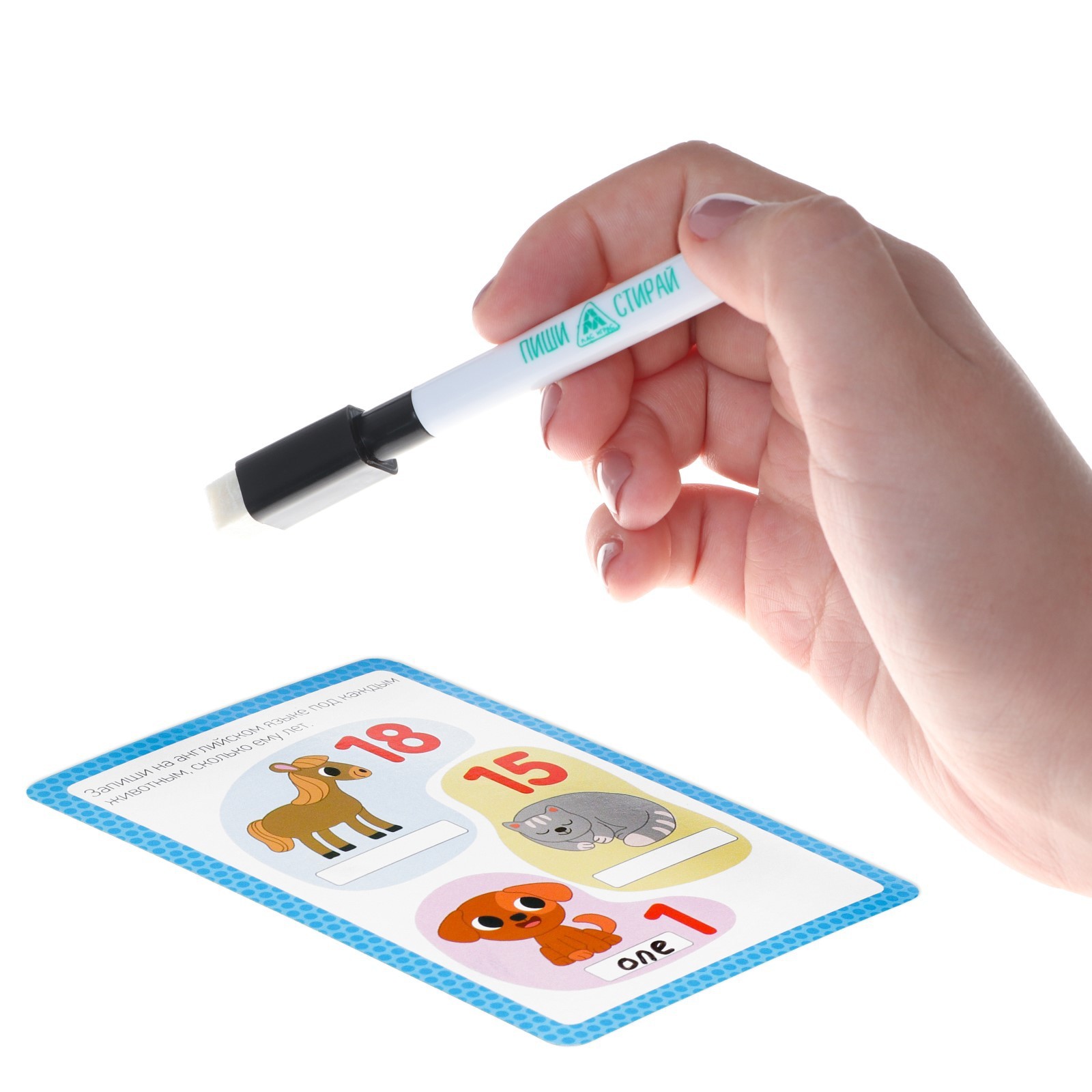 Возьмите карточку с заданием, покажите и расскажите ребёнку о задании и цифре. Прочтите слово на английском, пусть ваш ребёнок повторит за вами. Для закрепления знаний дайте ребёнку маркер из набора и предложите ему сначала обвести буквы на карточке, а потом написать цифру на английском языке.