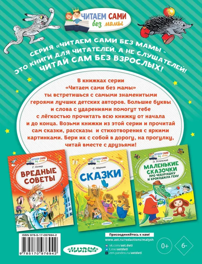 В книжках серии «Читаем без мамы» ты встретишься с самыми знаменитыми героями лучших детских авторов. Большие буквы и слова с ударениями помогут тебе с лёгкостью прочитать всю книжку от начала и до конца. Возьми книжки из этой серии и прочитай сам сказки, рассказы и стихотворения с яркими картинками. Бери их с собой в дорогу, на прогулку, читай вместе с друзьями! Для дошкольного возраста.
