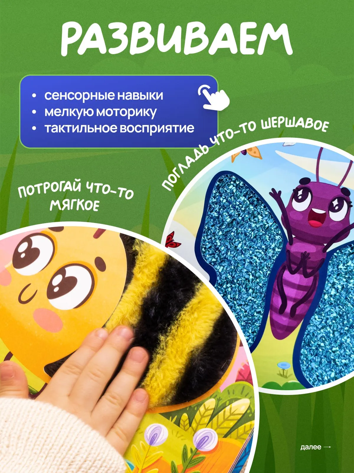 Развивашка расскажет детям истории о насекомых, она позволяет учиться в игровой форме и очень полезна для развития мелкой моторики.