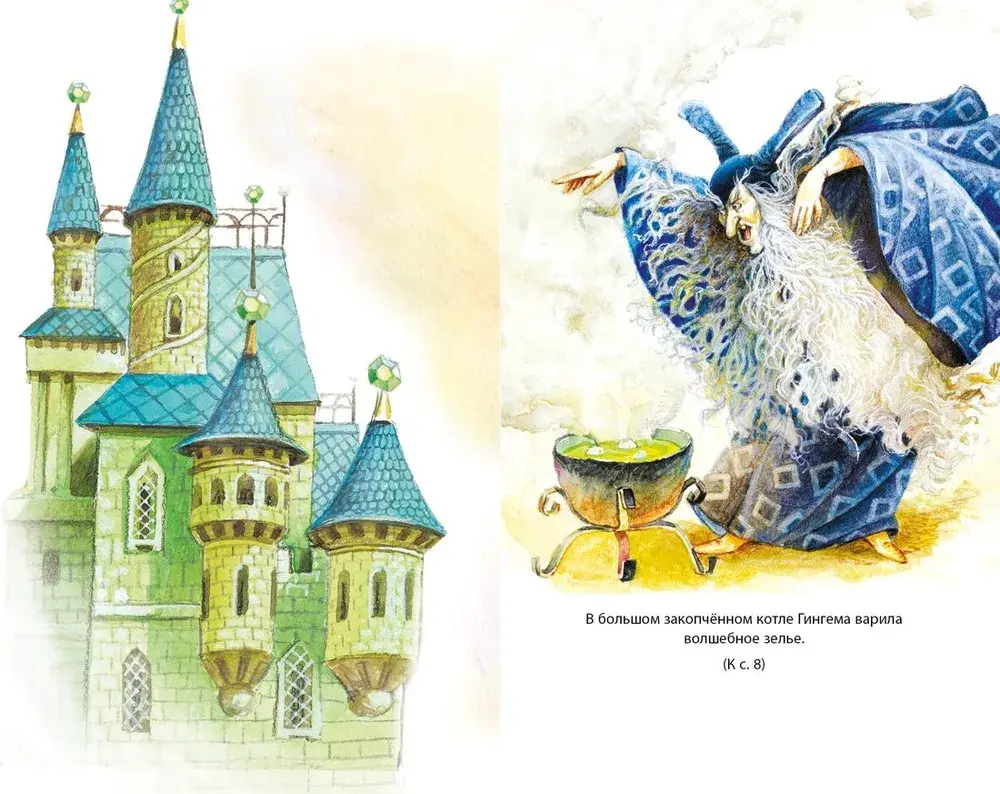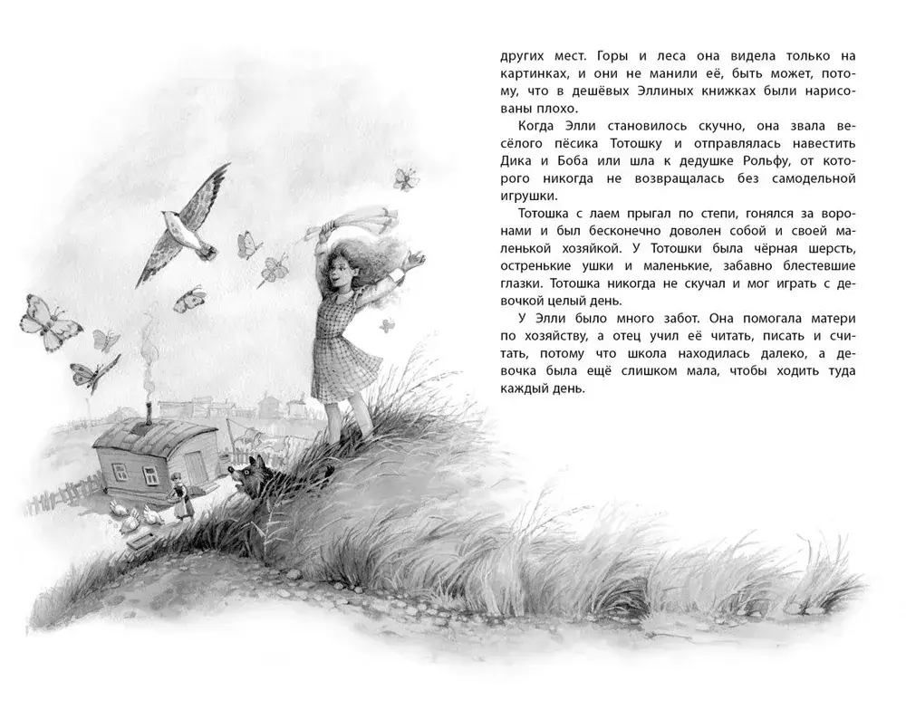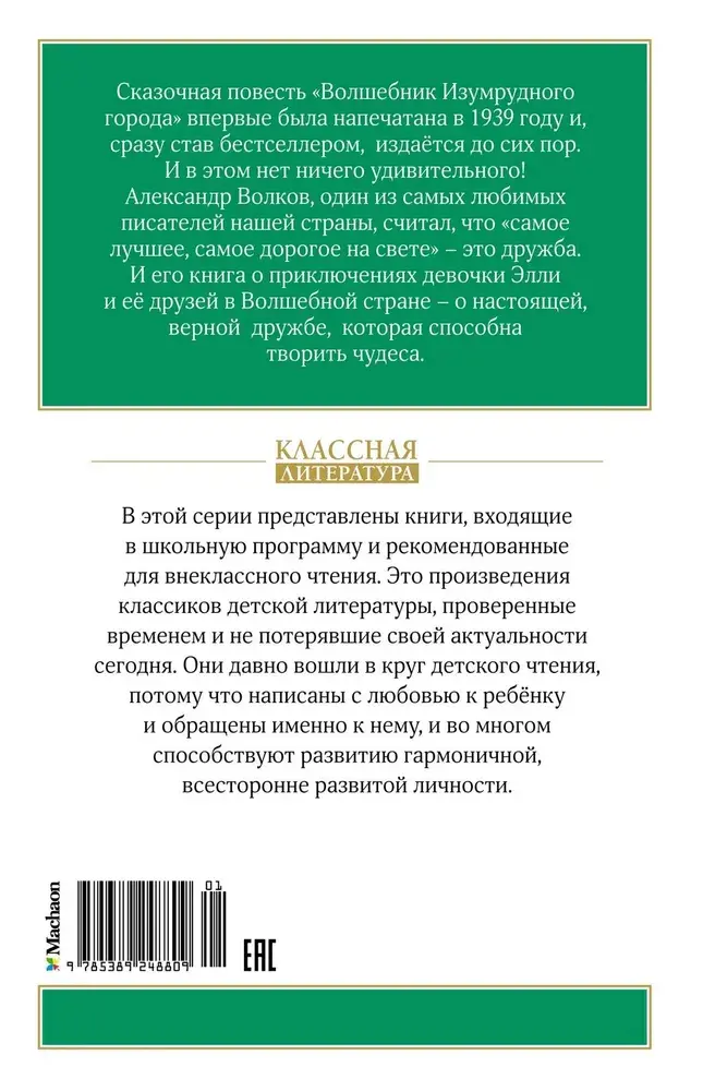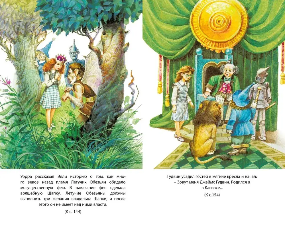 Герои книги - Страшила, Железный Дровосек и Трусливый Лев - мечтают об исполнении своих заветных желаний. Страшила хочет стать умным. Железный Дровосек - добрым и любящим, Лев - смелым и отважным, как и подобает царю зверей. А Элли больше всего на свете желает вернуться домой, в Канзас, к маме и папе. Ведь девочка удивительным образом оказалась в совершенно чужой и к тому же волшебной стране. Теперь только великий Гудвин, волшебник Изумрудного города, может помочь ей, а также её друзьям, в исполнении их желаний. И герои этой чудесной сказки отправляются по дороге, вымощенной жёлтым кирпичом, в далёкий Изумрудный город.